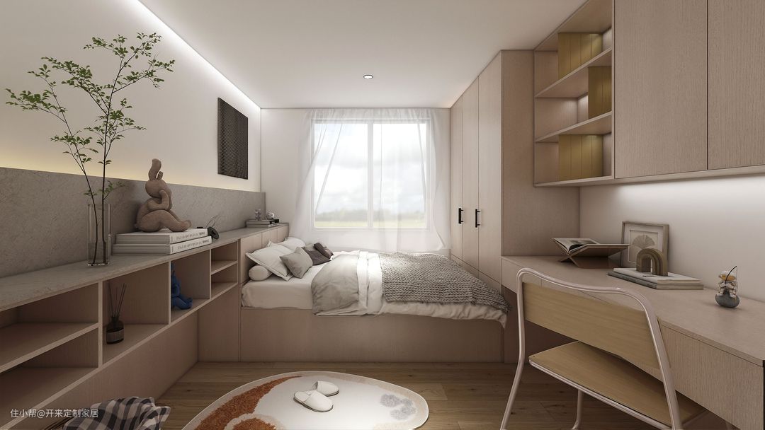 图2木纹材色榻榻米床尾衣柜一字设计书柜与书桌,视觉上具有延伸感。书柜开架满足收纳与装饰。