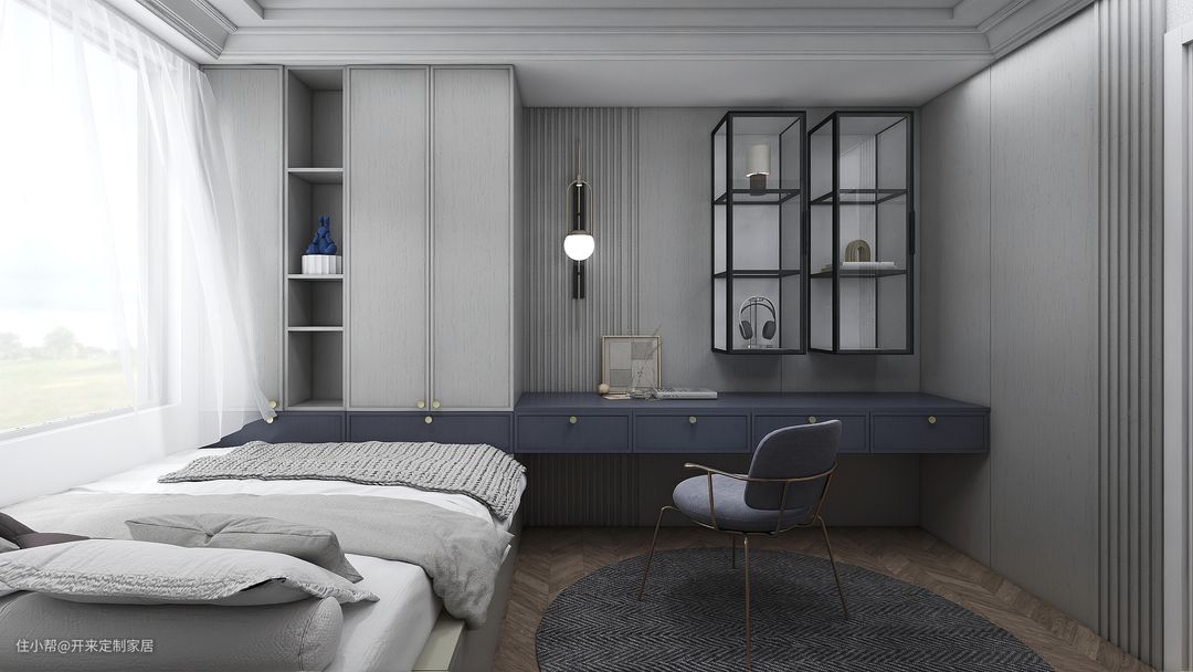 图8榻榻米穿插式设计悬浮长抽,一体打造床尾抽屉+衣柜+开架+书桌区,双排立柱三面通透玻璃吊柜搭配格栅与平板拼接护墙,蓝灰色系中富有简约低调的高级感。
