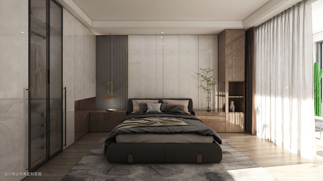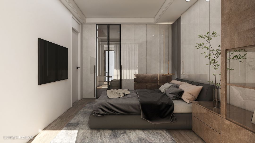 图6高光材质点亮空间,一体式床头柜+衣柜地柜,巧妙组成L型开放置物区,通顶黑色窄边框玻璃门让卧室空间更加通透灵动。