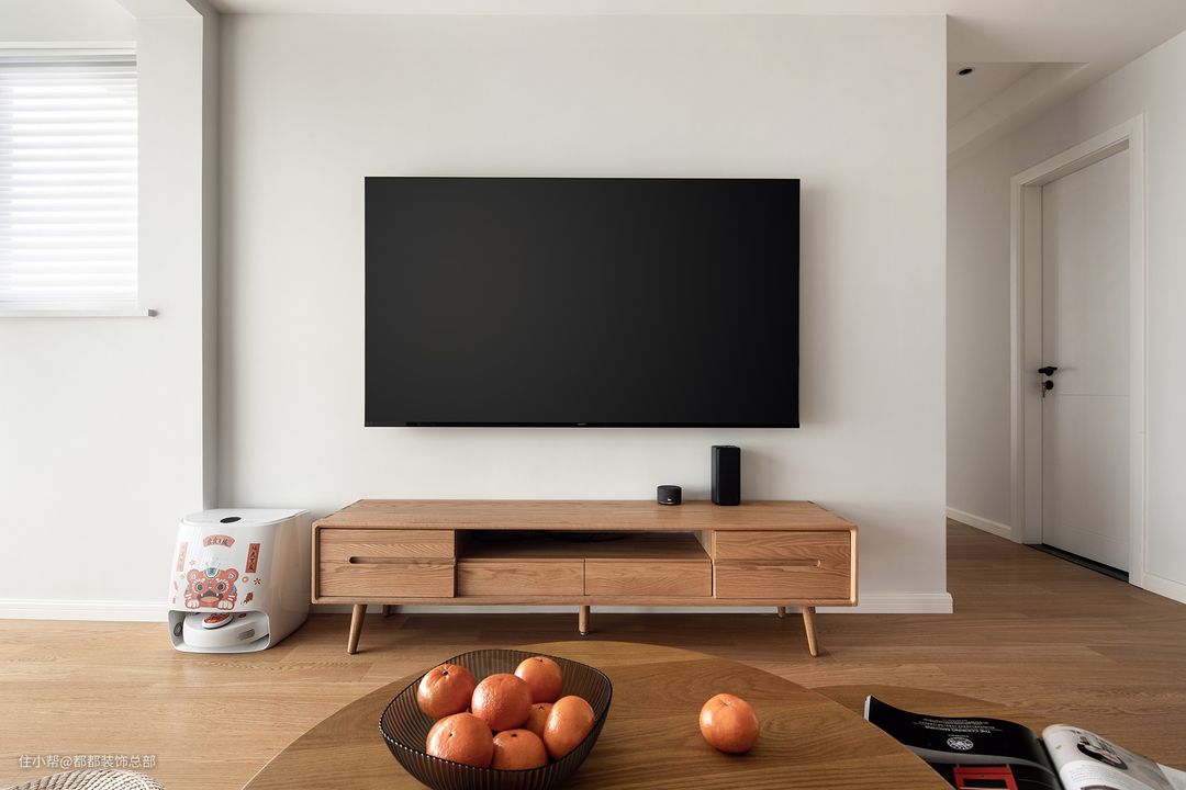 与其搞的花里胡哨,有时候还不如简简单单的大白墙,喜欢日式的,可以加上原木电视柜与绿植,感觉立刻就不一样了!