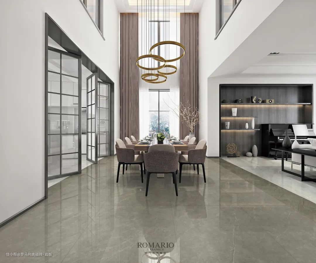 素雅柔和岩板至尊塞尚灰,纤细白色纹理绵延交错,立体灵动、高贵典雅,散发着名贵大理石的气息,与现代灯饰以及窗外自然景观组合下,整个空间极具原始自然的气质。