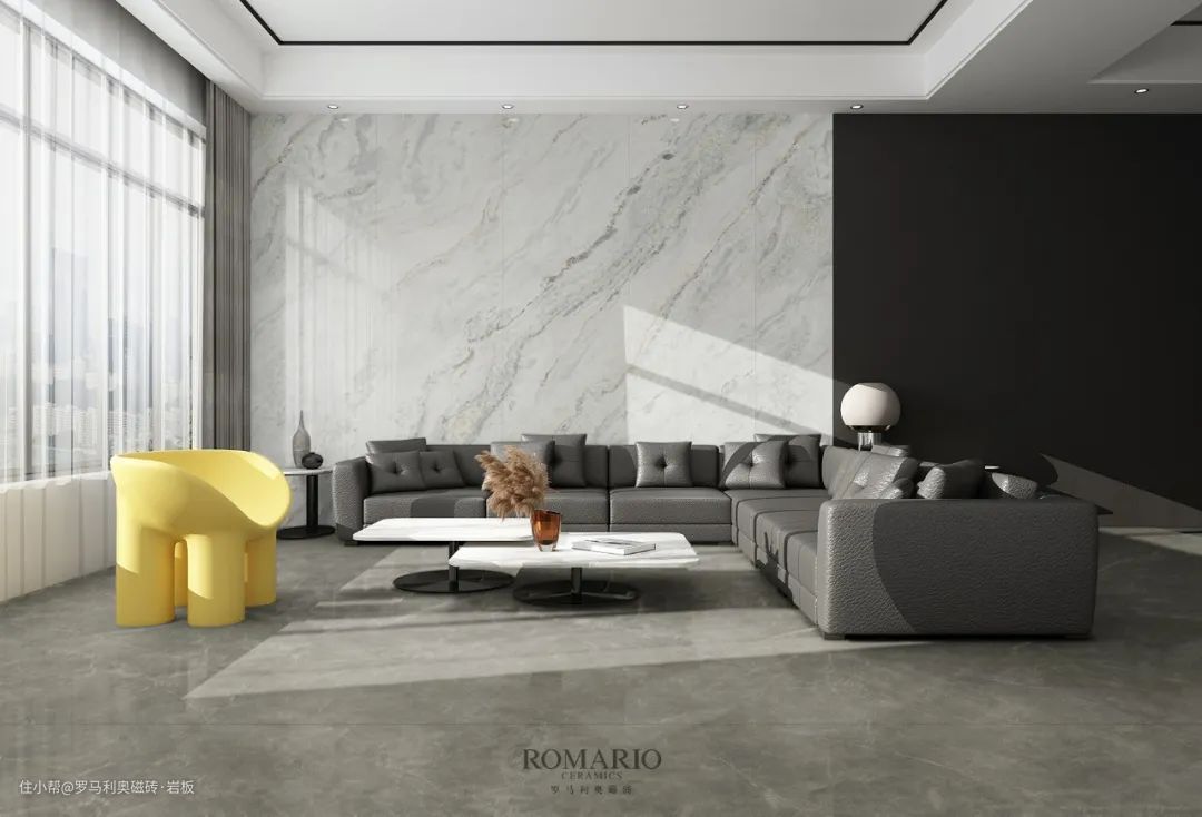 干净纯洁的岩板至尊温莎白,灰褐色纹理飘逸灵动极致还原天然石材纹理。明亮清爽的1000x2500mm至尊温莎白作为沙发背景墙以及地面装饰,与窗外的自然景观相互搭配,营造出安然舒适的氛围感。