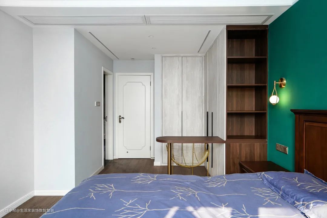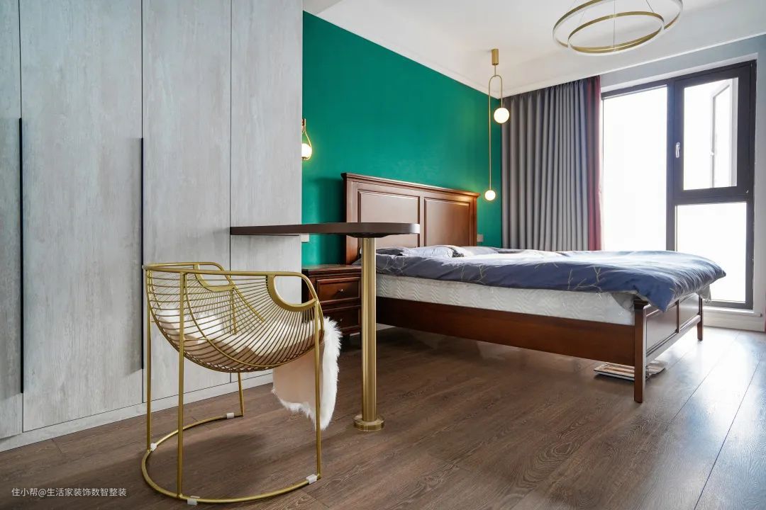 主卧床头用墨绿色涂刷,与黄铜材质的床头灯、深色实木的床头,形成业主喜爱的复古情调。