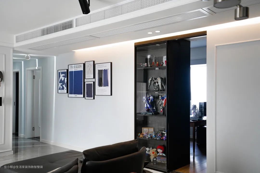 一方面,做一列展示柜,收纳陈列业主喜爱的模型收藏,黑色的柜体在白色的墙面上,自然形成了特殊的区隔。