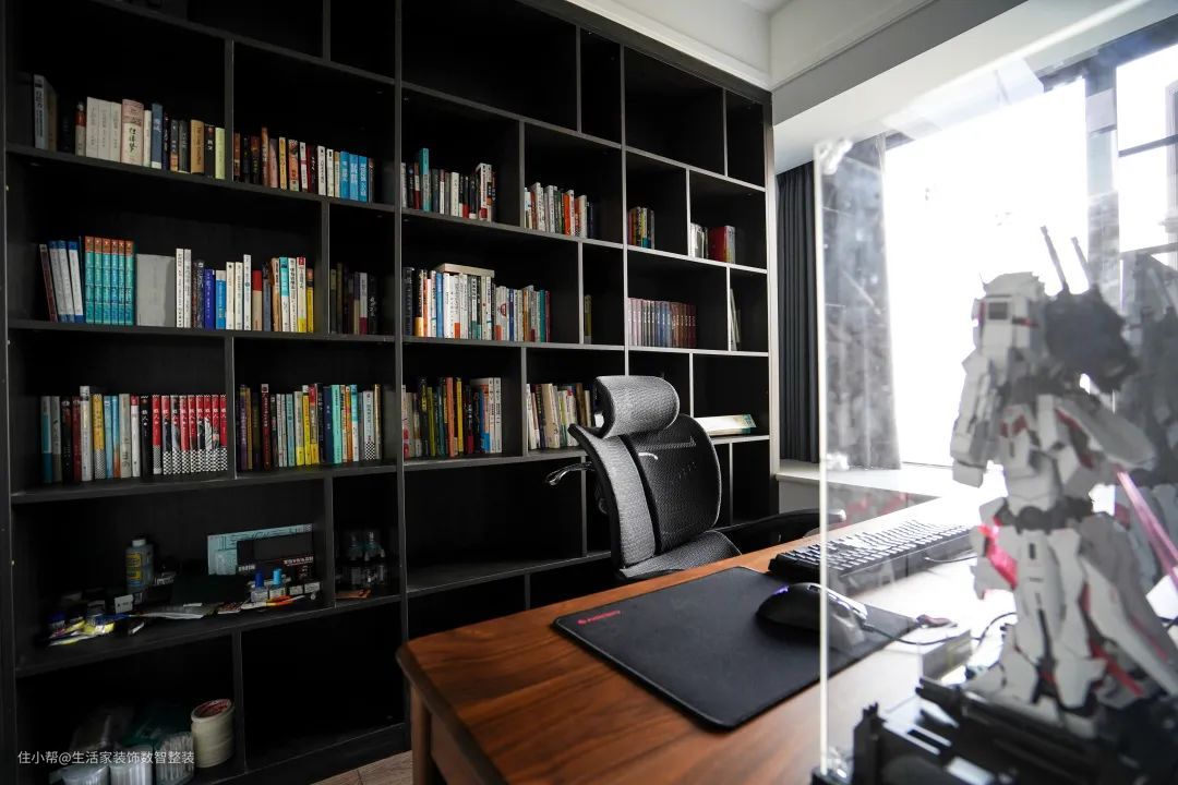除了书房门口那一面陈列柜作为标志,室内整面墙的书架,也展露出业主的爱好。