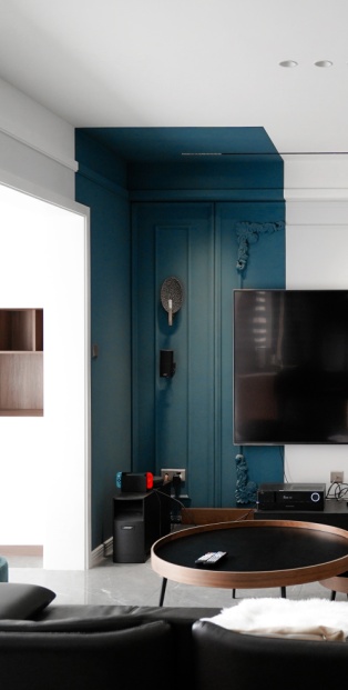 电视墙还是用蓝色、白色非对称拼接,石膏线则带着复古的情调,以电视为中心展开,形成优雅工整的美态。