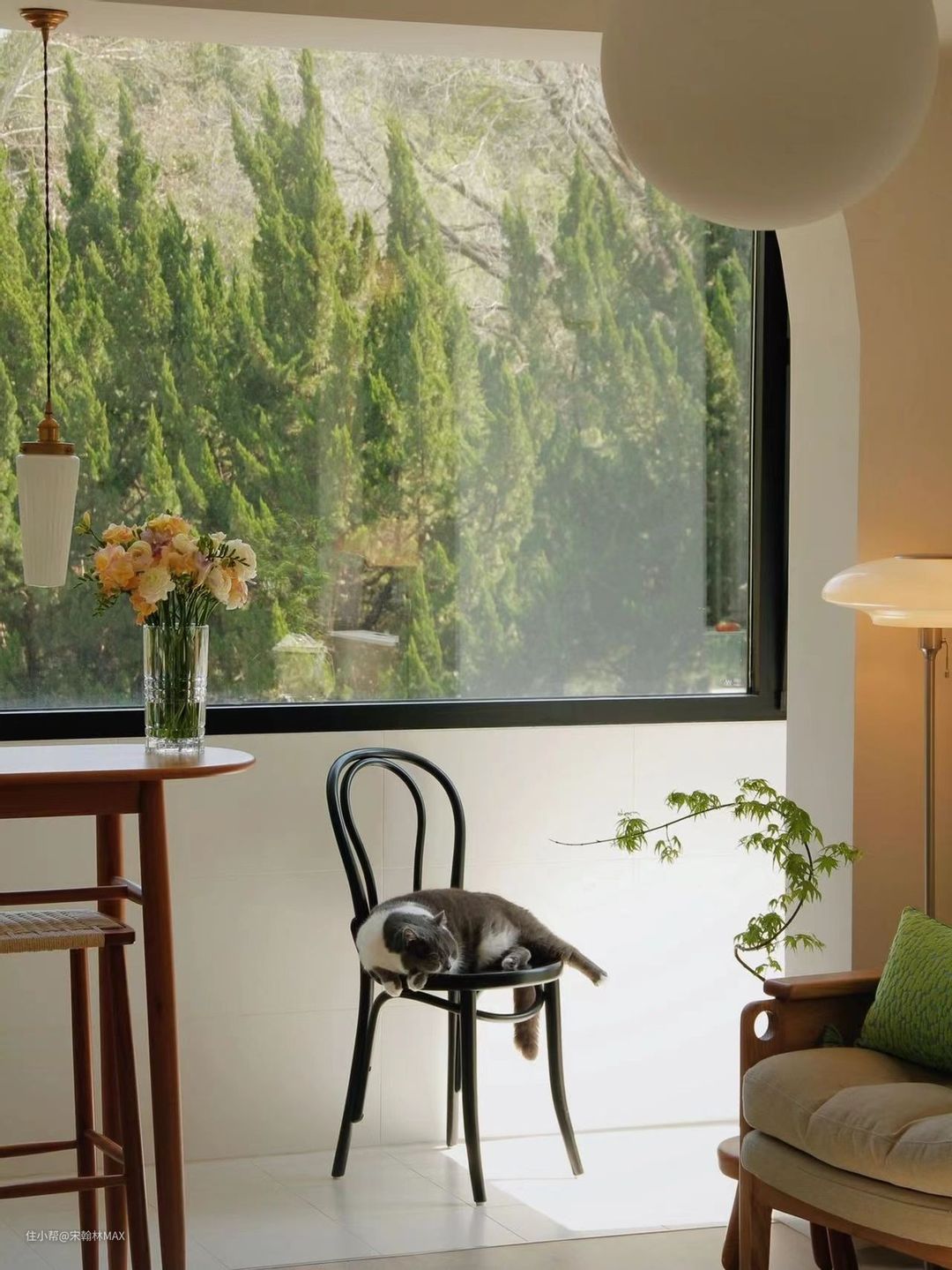 改造后夫妻俩得到了一个绿色系原木风的家,大大的窗户框出室外的四季,每一天的风景都是一幅画作,身在都市却像是住进了森林的感觉。
