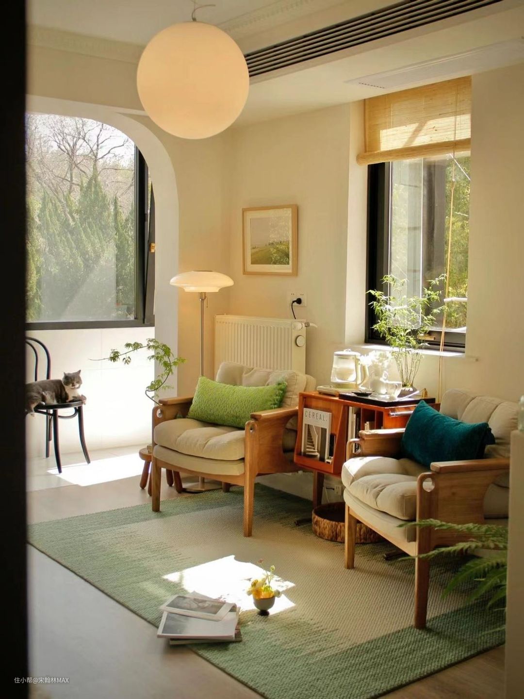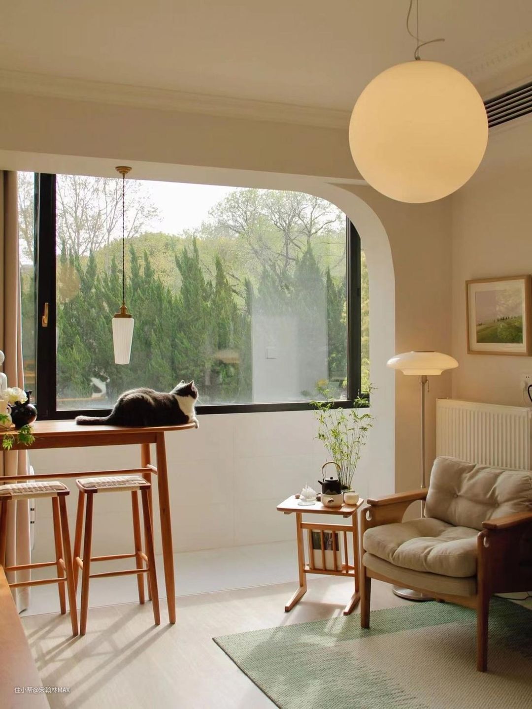 客厅与阳台之间的隔断做了半拱门形状的设计,透过拱门往外看,窗外的树梢就像镶嵌在相框里的绝美风景,四季都不重样。