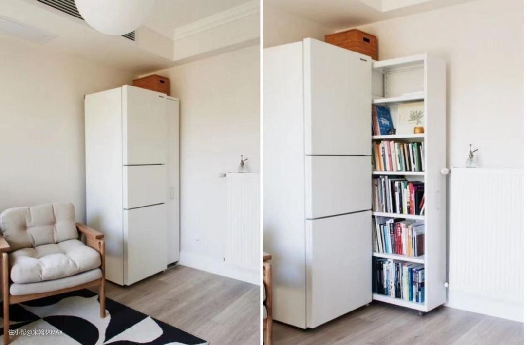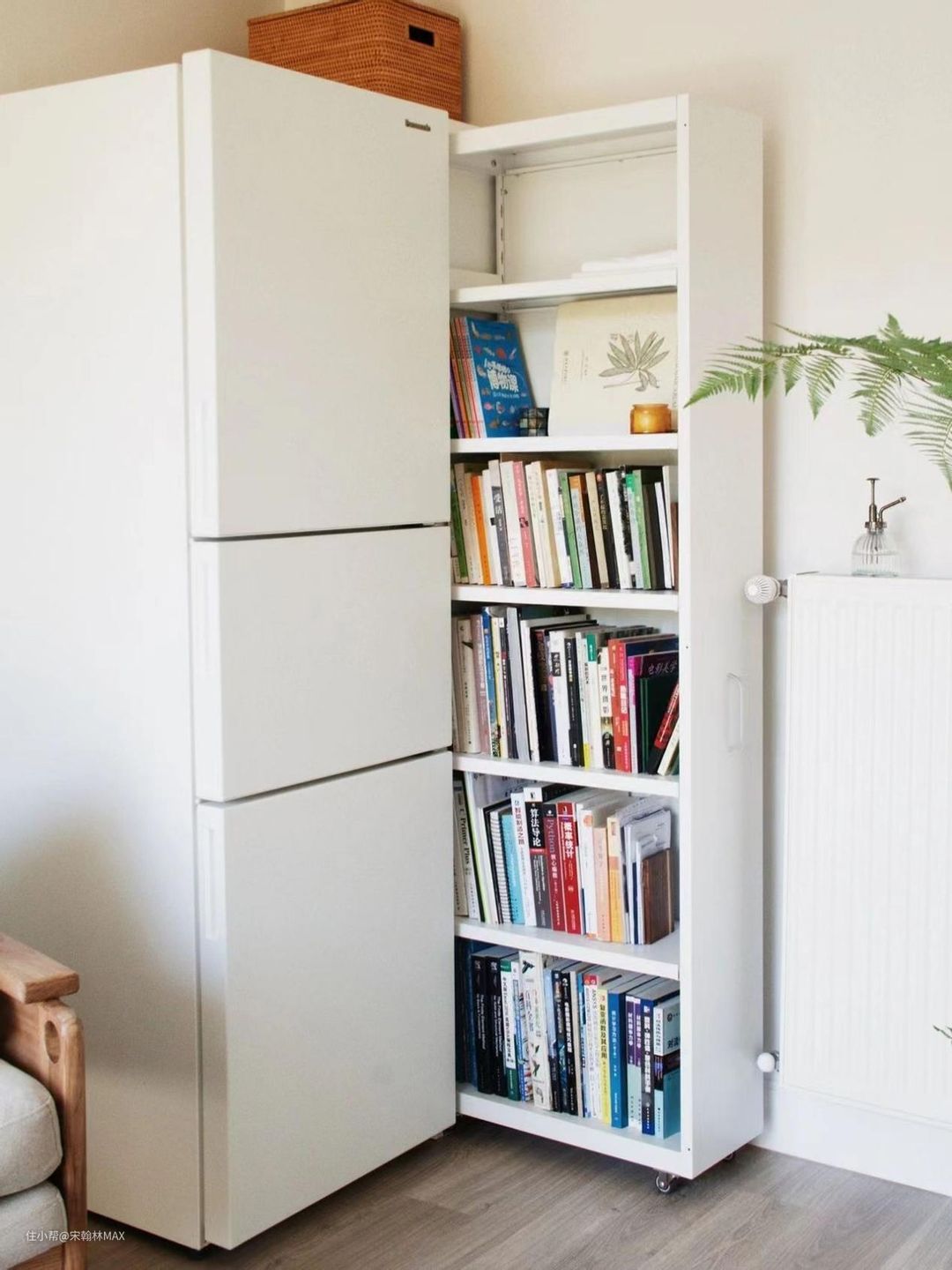 在客厅角落冰箱的侧面,定制了一个跟冰箱同等高度的白色铁皮抽拉柜,用来放置阅读书籍。