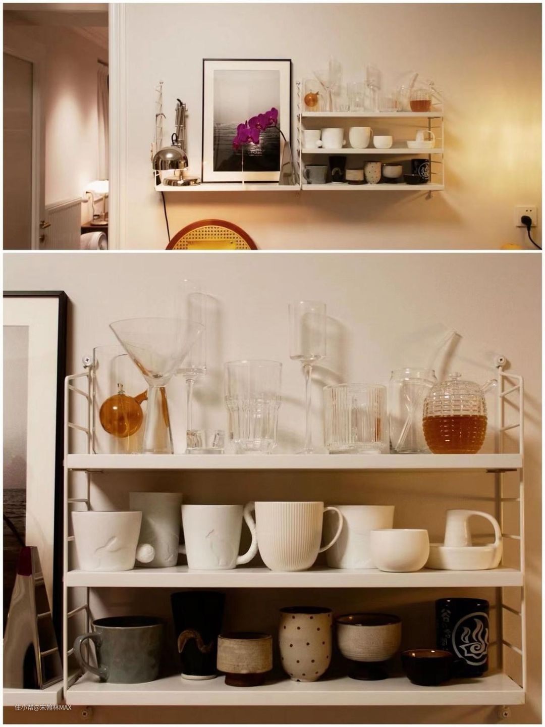 墙面安装了一排置物架,提高了空间利用率,节省了台面空间,可以用来随手放置一些餐具水杯。