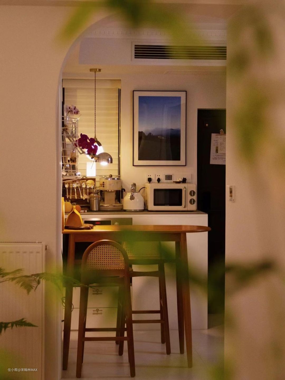 放弃了传统餐桌,而是使用了更节省平面空间的吧台桌椅,高脚设计抬高视觉重心,使得整个空间看上去更加开阔轻盈。