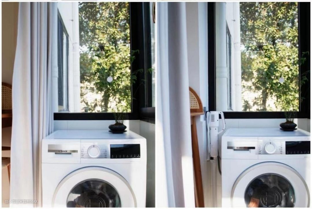 为了遮蔽阳台角落立放的一些清洁用具,在旁边安装了两头都不固定的窗帘,可以任意悬停,用来遮蔽清洁工具。
