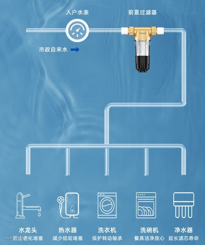 前置过滤器一般安装在管道的前端,用来过滤自来水中的泥沙、铁锈、虫卵、红虫等大颗粒物质。