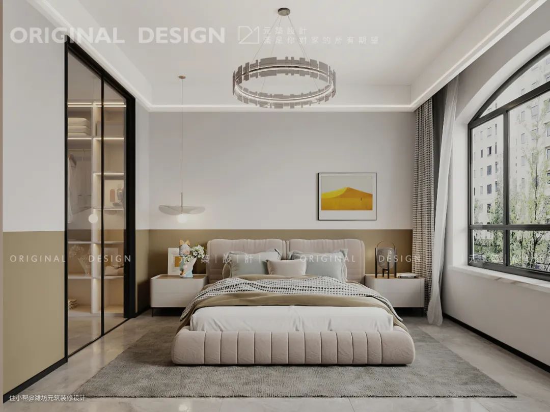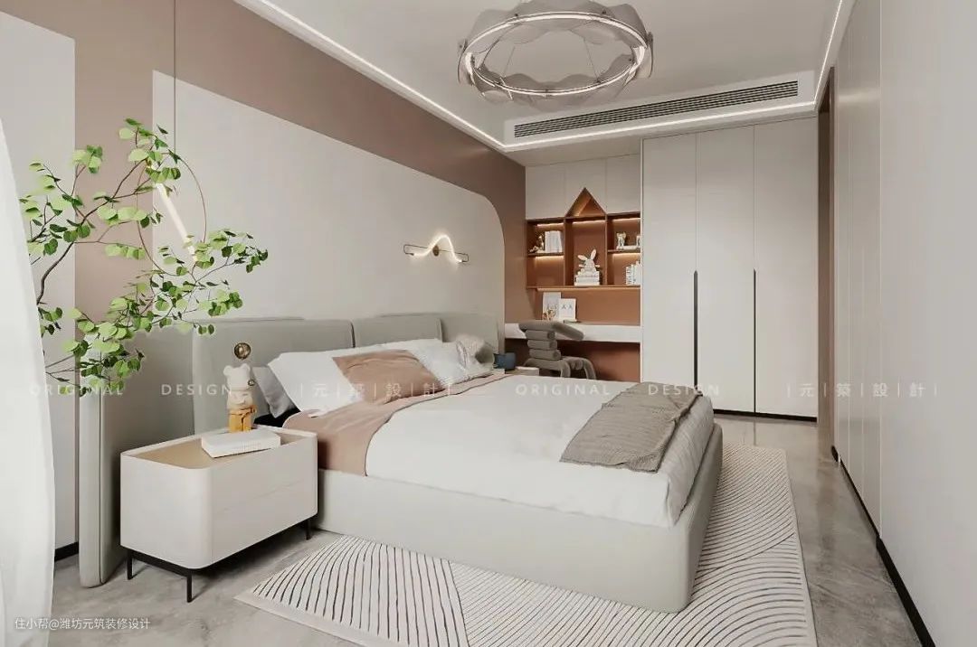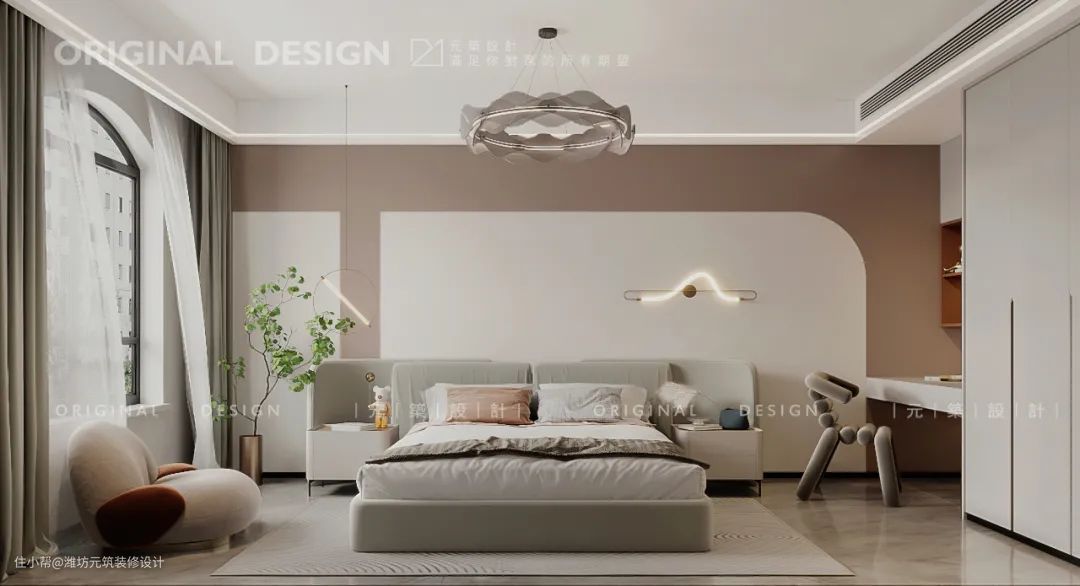 小女儿房间的床头背景,通过白色与脏粉色的碰撞自带简约高级感,弧形线设计自带舒适感,因为柔美的曲线的曲线带来视觉延伸,融合线条元素,即温馨又浪漫。