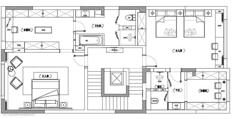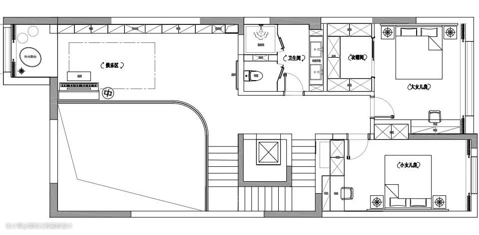 三楼是主卧套房包含睡眠、梳妆、衣帽间设计,两个孩子较小共处一个房间,方便照顾。