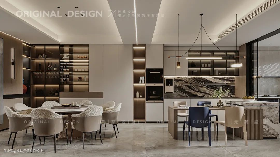 一日三餐四季,属于自己的小幸福,岛台与木质餐桌,承载一家四口日常所需。经典蓝餐椅打破常规的色彩代表着自己的生活态度,为空间注入不凡的格调。