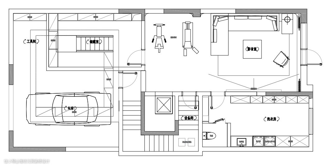 负一主要作为屋主的休闲娱乐区,规划了健身区、观影区、洗衣房、储藏室。