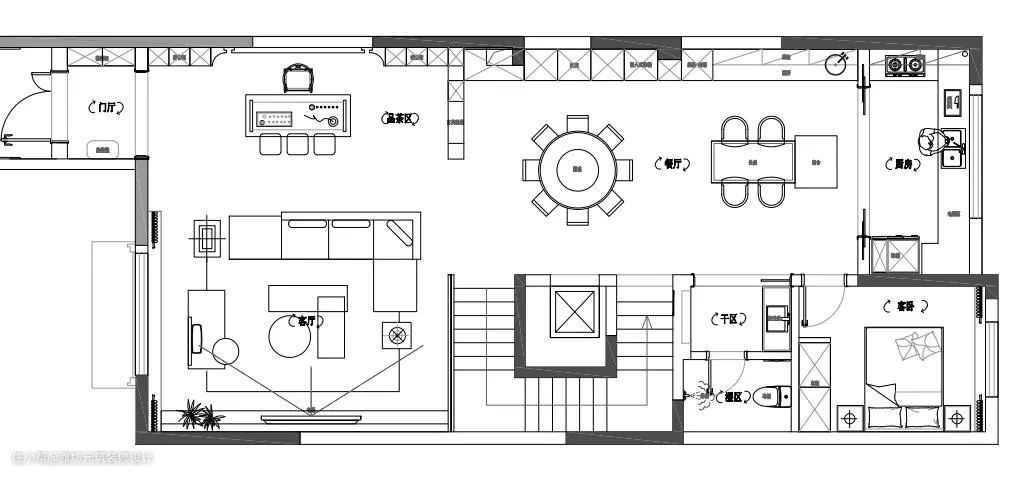 一楼主要规划了多功能客厅,客厅连通品茶区、社交型餐厨空间,无主灯设计、长辈房。