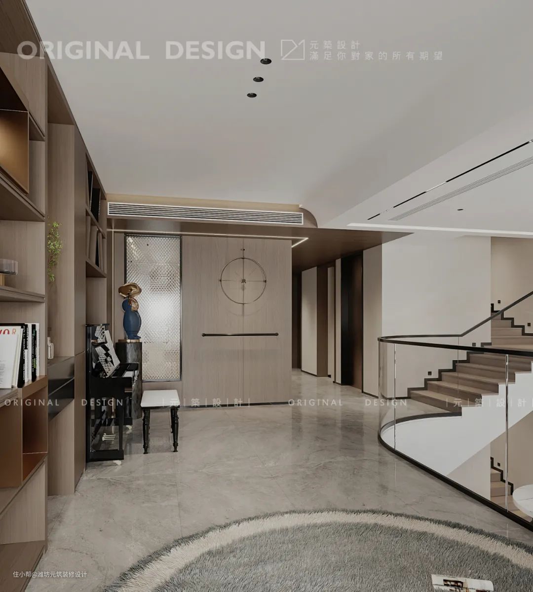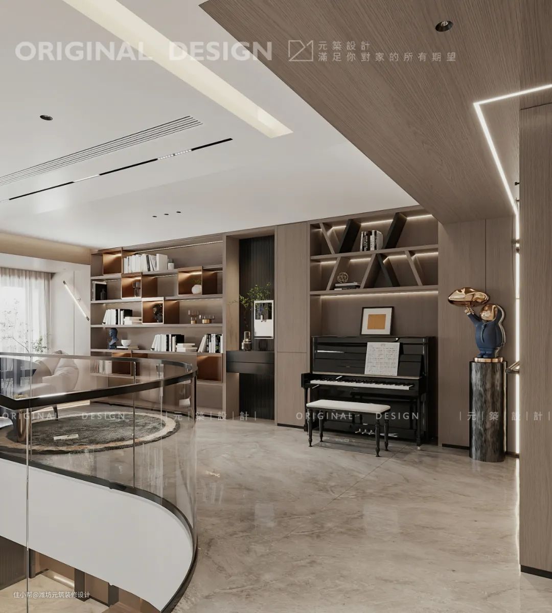 二楼多功能休闲区,日常阅读放松弹钢琴,质感温润的木色书架。给空间倾注饱满而温柔的气质。以立体化的设计,诉说着高雅品位的生活方式。