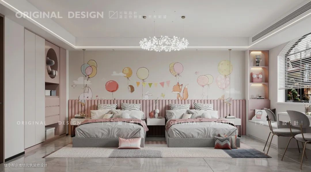 低饱和度的粉色为主色调,搭配充满童趣的壁纸,是大多数女生钟爱的颜色,小姐妹的两床相邻,便于孩子之间交流感情。