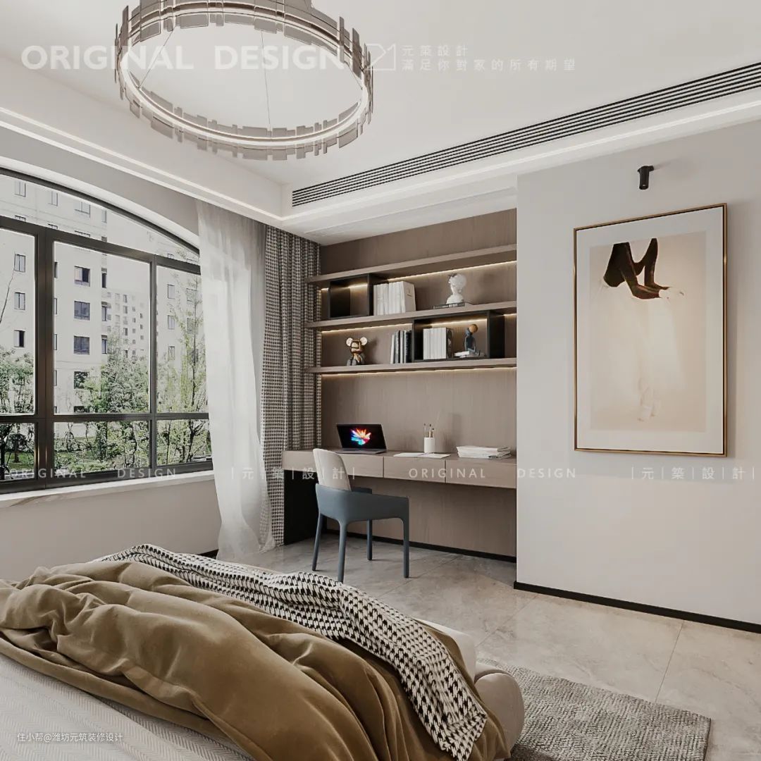 浅粉色和焦糖棕色搭配让卧室透露出一丝宁静,搭配书桌在这宁静的环境下学习和办公不仅可以事半功倍,也能让心情不会那么的繁重。