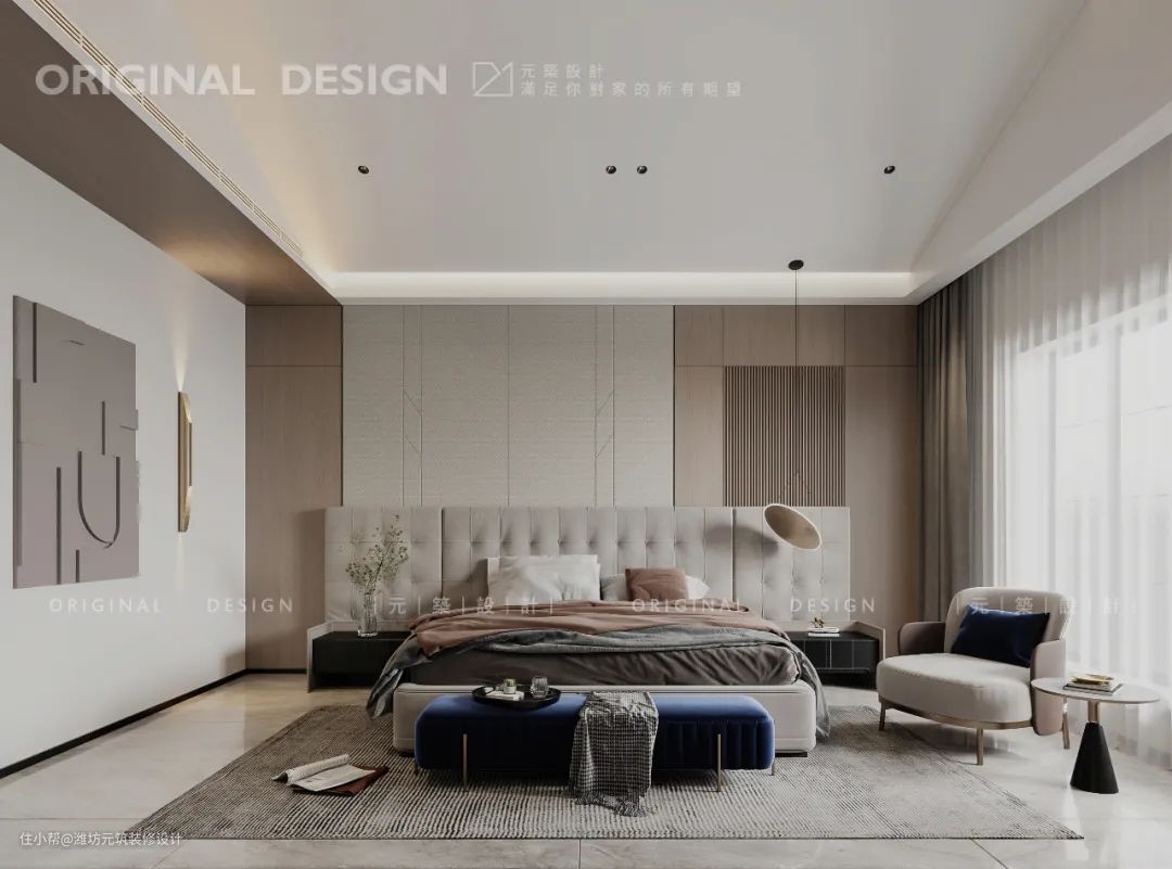 主卧套房式设计,连接衣帽间与卫生间,让动线更加合理。低饱和度的高级灰床品,以极强的包裹感带来舒适放松的视觉感知,经典蓝色调的点缀,优雅且藴藏十足的生活美学。