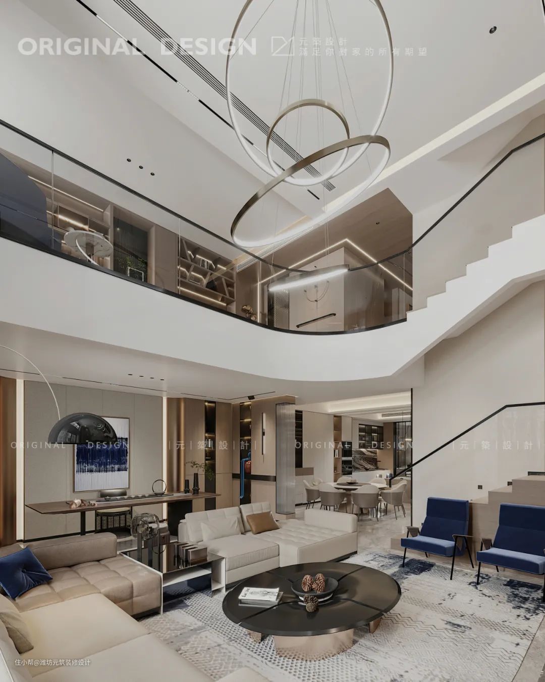 客厅挑空设计,视觉通透明亮,弧形造型呼应,层次丰富。空间中经典蓝相互点缀极具艺术感,是客厅的点睛之笔。电视墙大理石纹理如水墨画般,气势恢弘,成为客厅的独特风景。