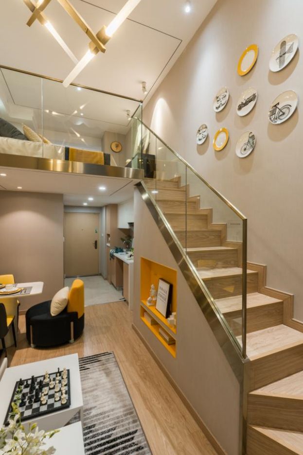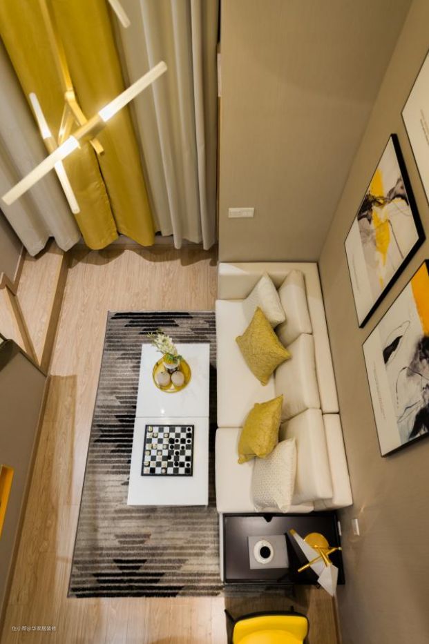 loft挑高做隔断,上方居住,下方休闲,区域划分清晰明确,整体以黄色为主色调,楼梯下做了储物,一点也不浪费空间