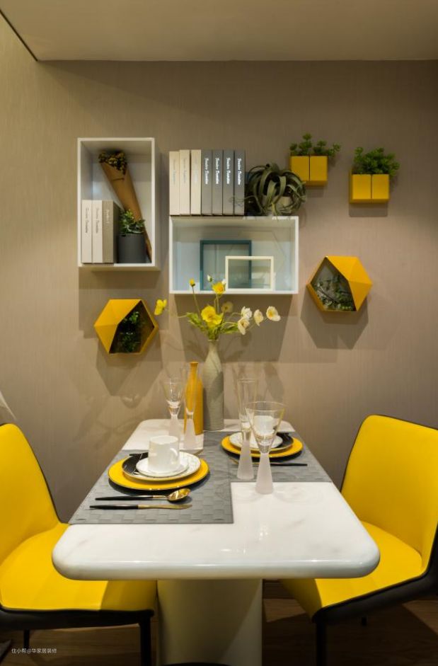 餐桌墙上做小吊柜,不同风格造型,一是装饰,二是收纳,空间应用淋漓尽致