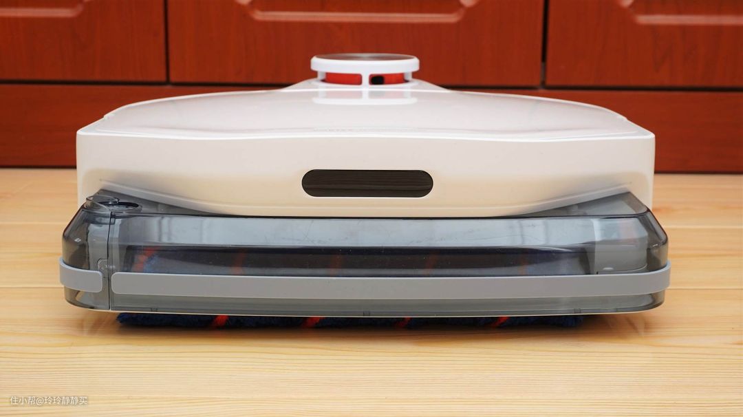除了机身高度略厚(主要是因为内置了水箱)。前面横向、机身等宽的滚刷组件外,跟常见扫地机器人没啥区别。