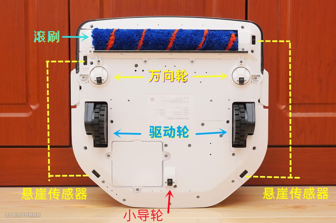 底部的结构跟常见扫地机器人有挺大区别。滚刷在最前端,有两个小万向轮,后面有一个小导轮,有4个悬崖传感器,相比现在常见的6个传感器的,略少。
