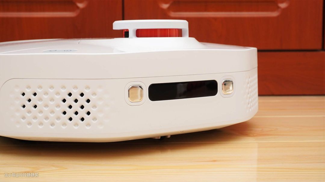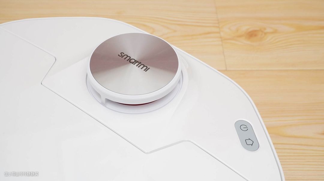 上方有带有“smartmi”标识的雷达罩,右侧是按键区:开关机键和回充键(具体功能后面细说)。