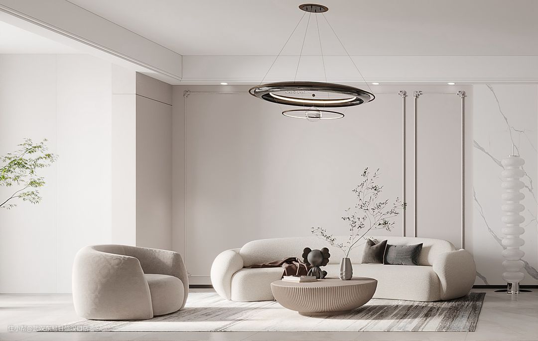 设计师以不同色调区分空间功能。客厅空间大气明亮,电视背景墙以长城板为基底,设计曲线屏风造型装饰,浅暖色搭配极简线条,双眼皮吊顶,打造出一个温馨健康的家居环境。
