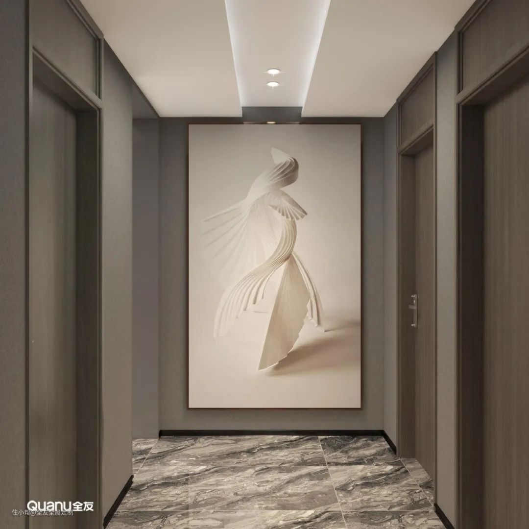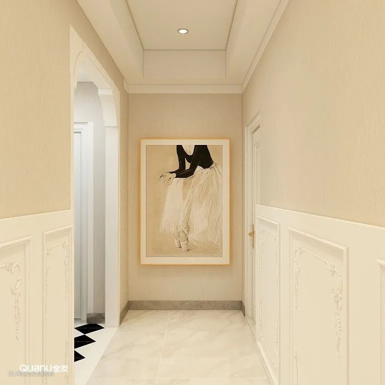 如果是美式、法式风格,还可以利用石膏线做装饰,利用几何线条带来立体且复古的空间感,让走廊更有层次。