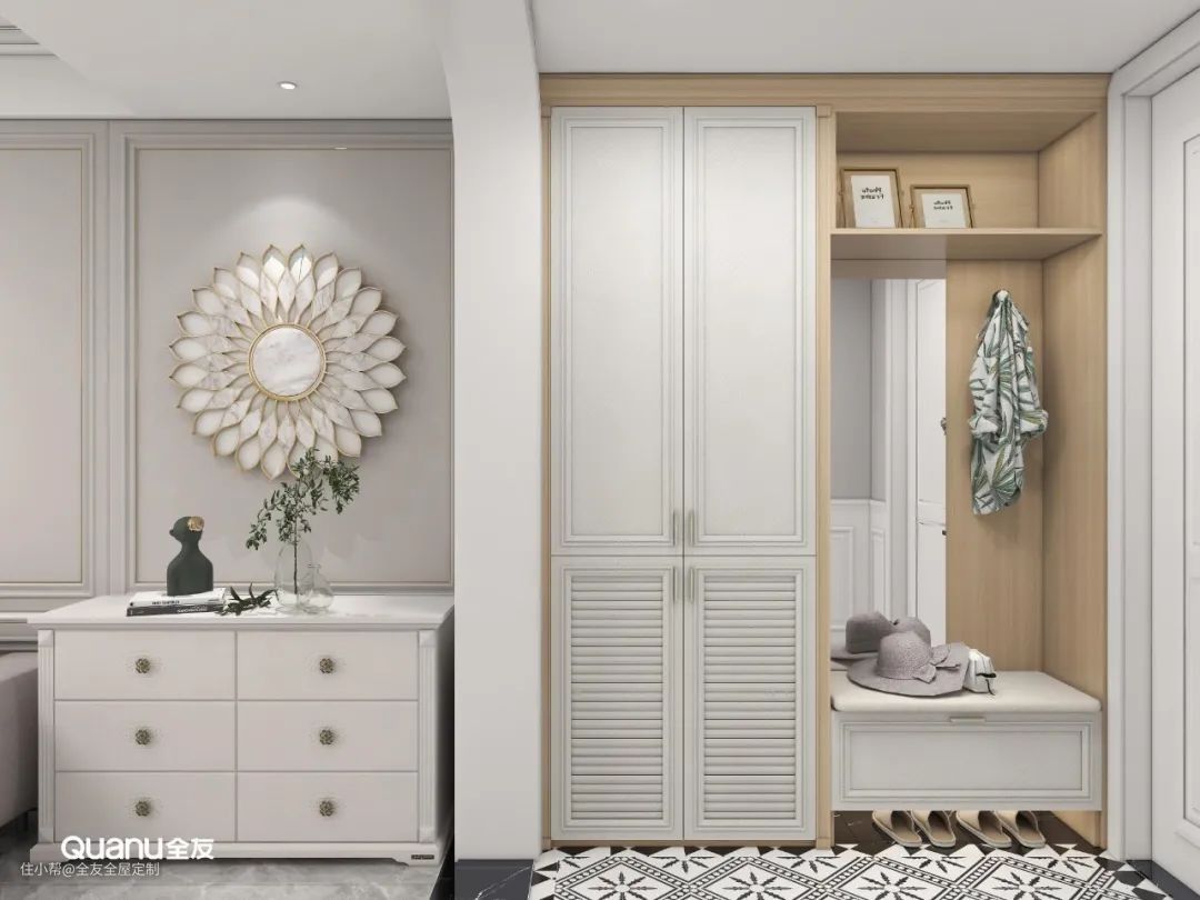 为了方便日常生活,还可以在玄关处定制卡座+全身镜,换鞋不用再“做深蹲”,出门前还能整理仪容。