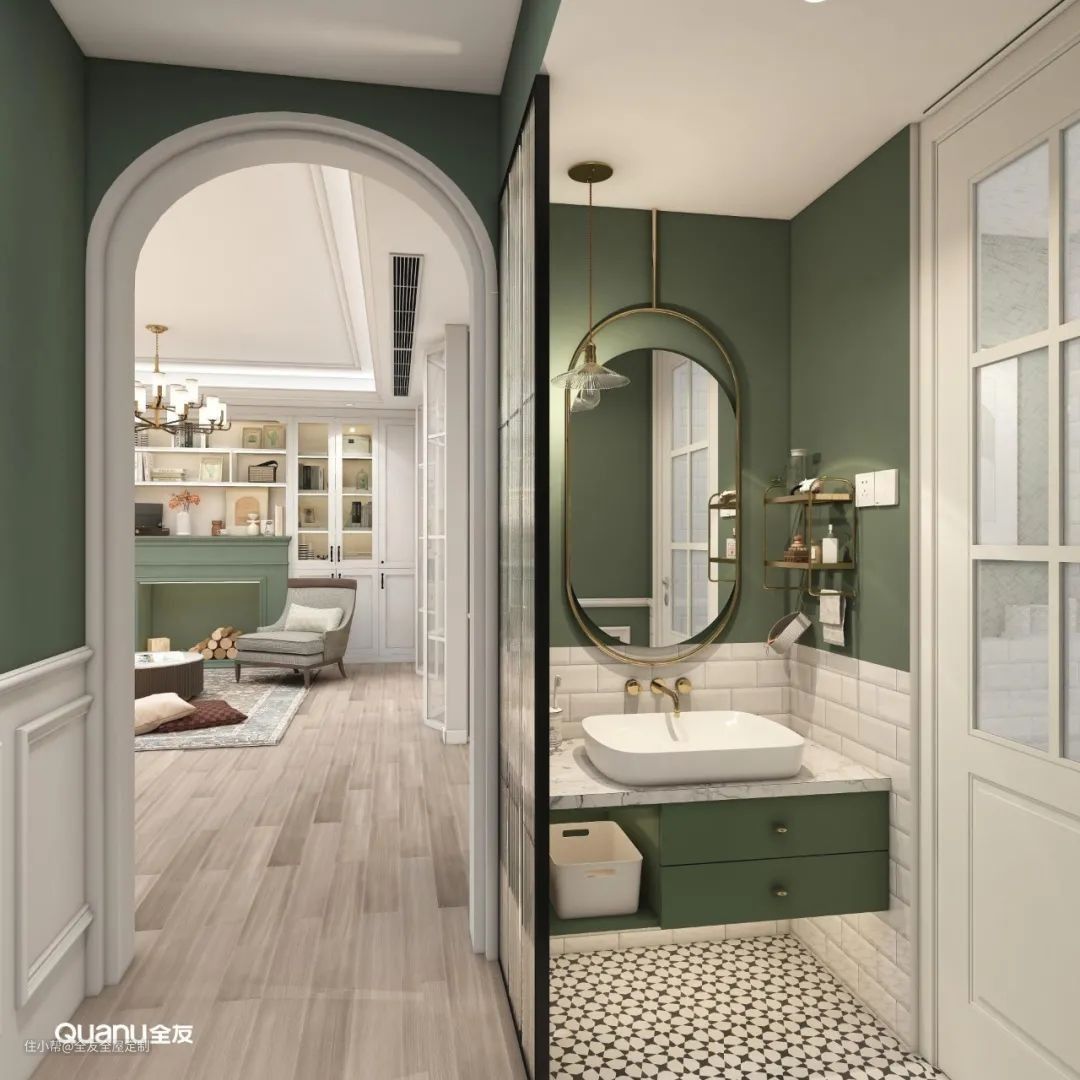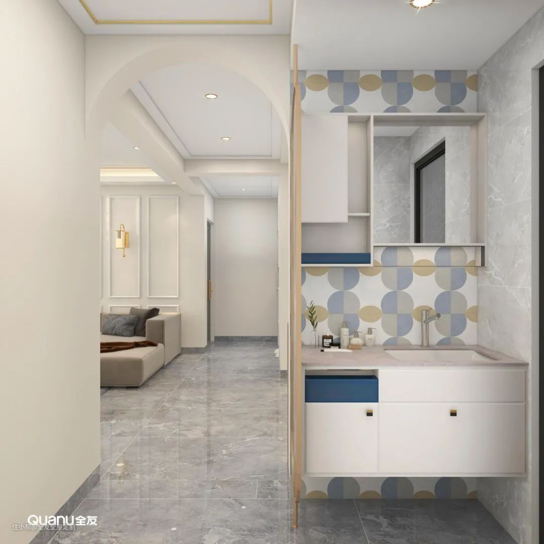 如果卫生间旁边就是走廊的话,我们可以在走廊隔出一个小空间,将洗漱台从卫生间独立出来,做到彻底的 “干湿分离”,这样不仅使用起来更加宽敞,还能提高生活效率。