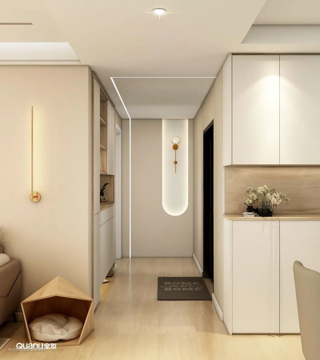 走廊空间被墙体遮挡,基本上没有采光,所以此处的照明设计也要做到位。我们可以利用筒灯进行局部照明,它具有小夜灯的效果,可以让人借着光线过渡到其它区域,自然柔和的灯光也可以营造出温馨的空间氛围。