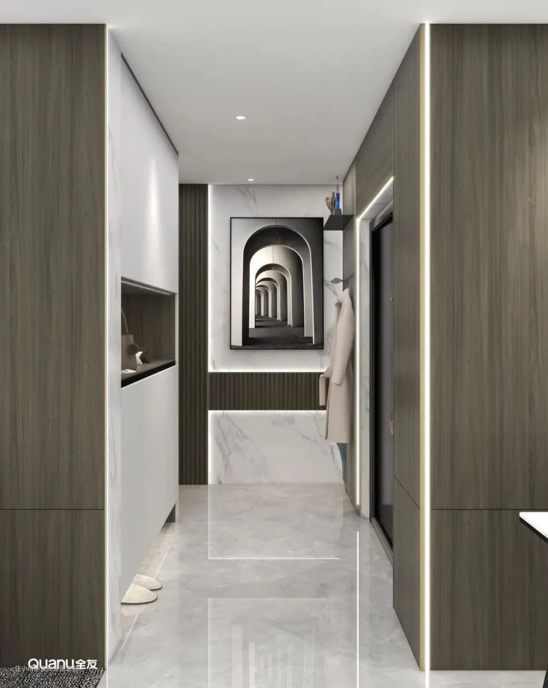 说到走廊柜体,最常见的就是玄关柜。很多家庭的入户空间都是狭长的过道,在一侧定制到顶式柜体,中部留空,方便进门置物,底部留空,放置常穿的鞋子。