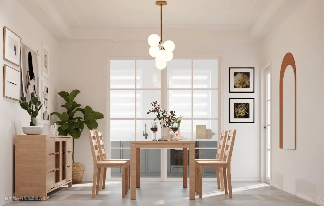 餐桌可以靠墙或中央靠近客厅摆放,家具风格统一时,往往可以在视觉上营造出1+1>2的空间感。