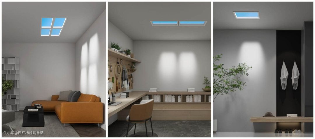我看了一眼把青空灯装在客厅、书房、玄关等位置的渲染图效果,比装在卫生间更加温馨真实。可惜家里的石膏顶无法满足安装条件,也算是省钱了…
