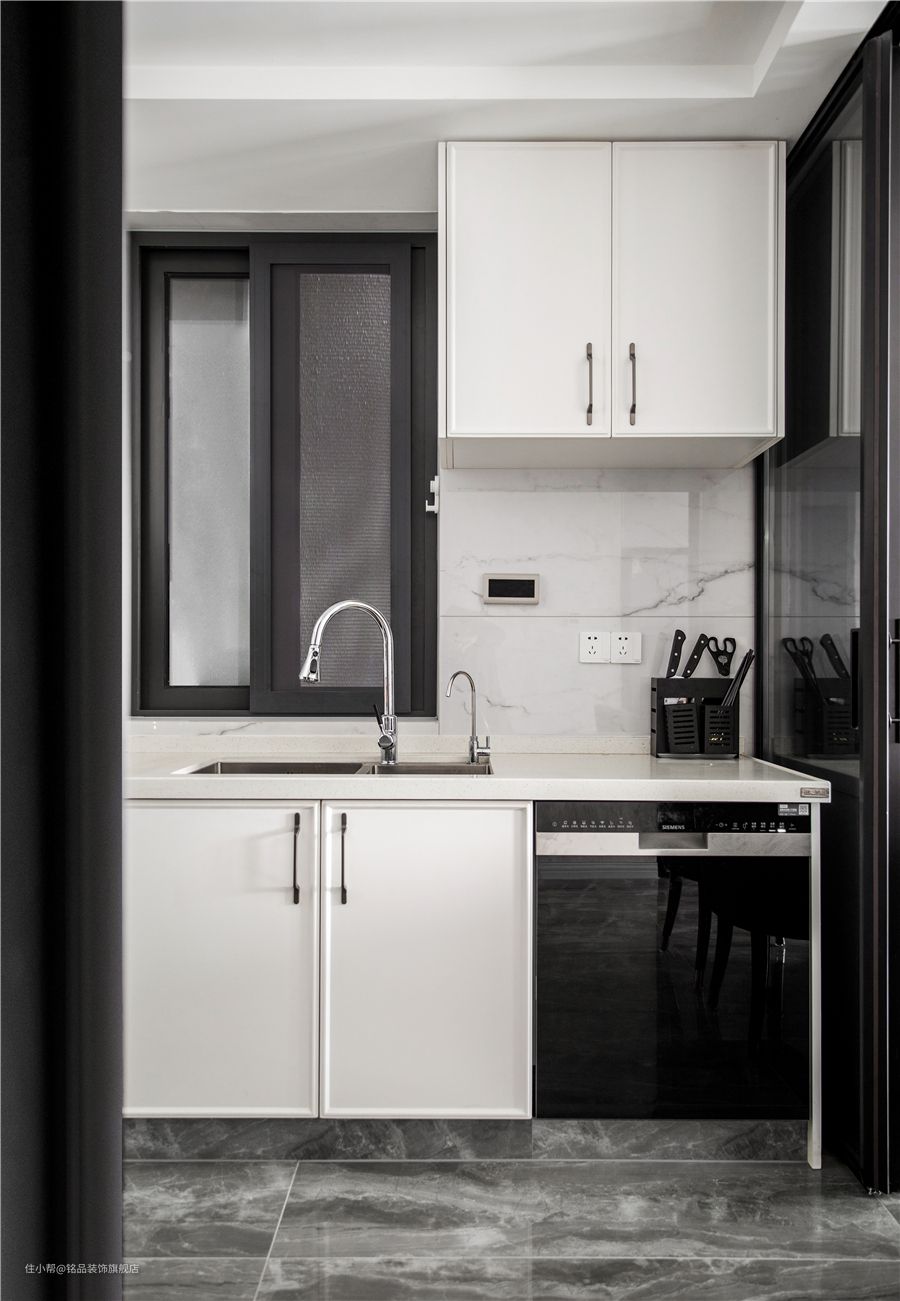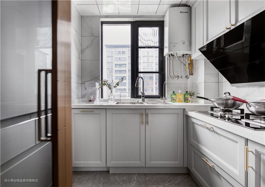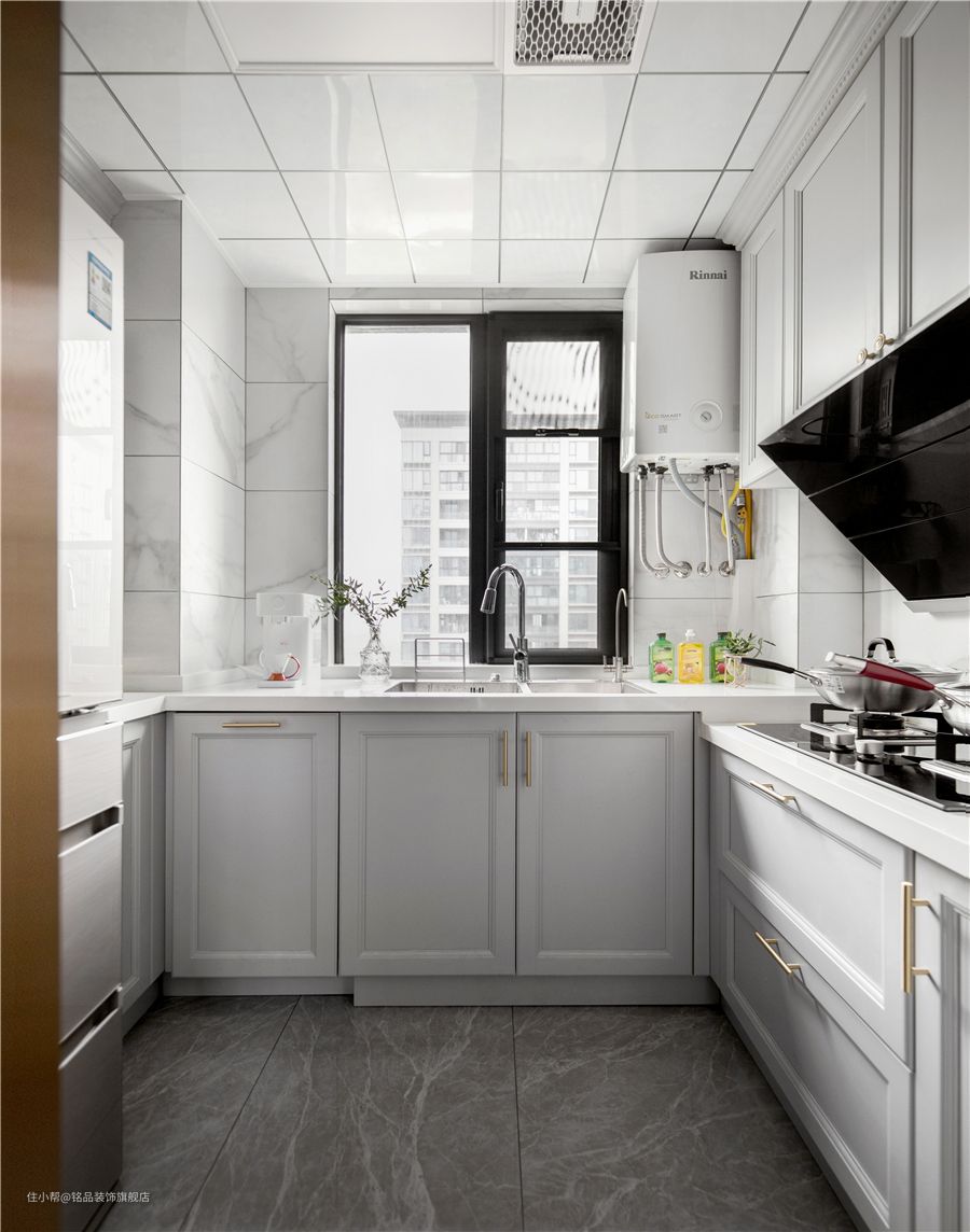 厨房采用L型布局最最常见的。它可以与大小户型完美兼容。设计符合金三角动线原则,可以减少厨房的行走距离,使厨房清洁、准备、烹饪一次完成,实现高效用餐!