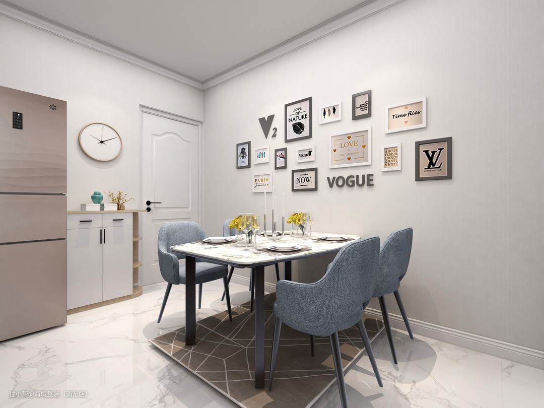 入户门便是餐厅的位置,整体没有过多的柜体设计,整体的色彩米白色为主,鞋柜采用可以移动的设计,洗簌台采用玻璃屏风半隔开,镜面采用柜体的形式方便放置洗簌用品,这样看来整体不会显得乱。餐厅的墙面可以设计挂画与洞洞板设计,都是可以的,根据个人的喜好而定。餐椅是空间上最为突兀的色彩,提高整体的优雅感与舒适感。