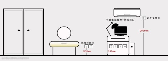 3.床对面或侧面墙上应该预留1-2个插座,方便使用风扇之类的小家电。