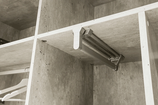 当吊挂衣物高度过高,大部分人会使用下拉衣杆,有别于普通衣干,将拉杆下拉衣干也随之下降,方便拿取吊挂高处的衣物;另有伸缩式衣杆,可作为试衣架,平时收整至柜内,搭配衣物时可拉出暂时挂置,让床上不再堆满衣物。