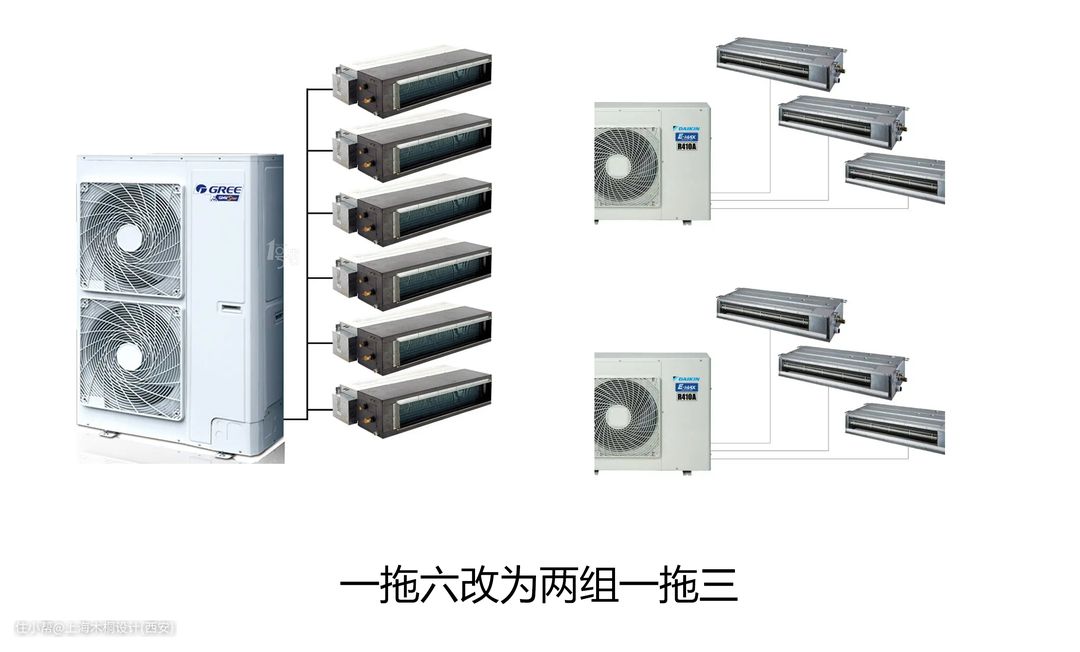 有些大户型,比如说四室两厅,按道理应该选择一拖六的配置,但是一拖六的主机尺寸过大,影响采光,而且部分房间管路会过长,影响制冷制热的效果。这个时候可以采用两个一拖三,或者一拖四+一拖二来进行灵活合理的配置,而且基本上价格差距不是很大。
