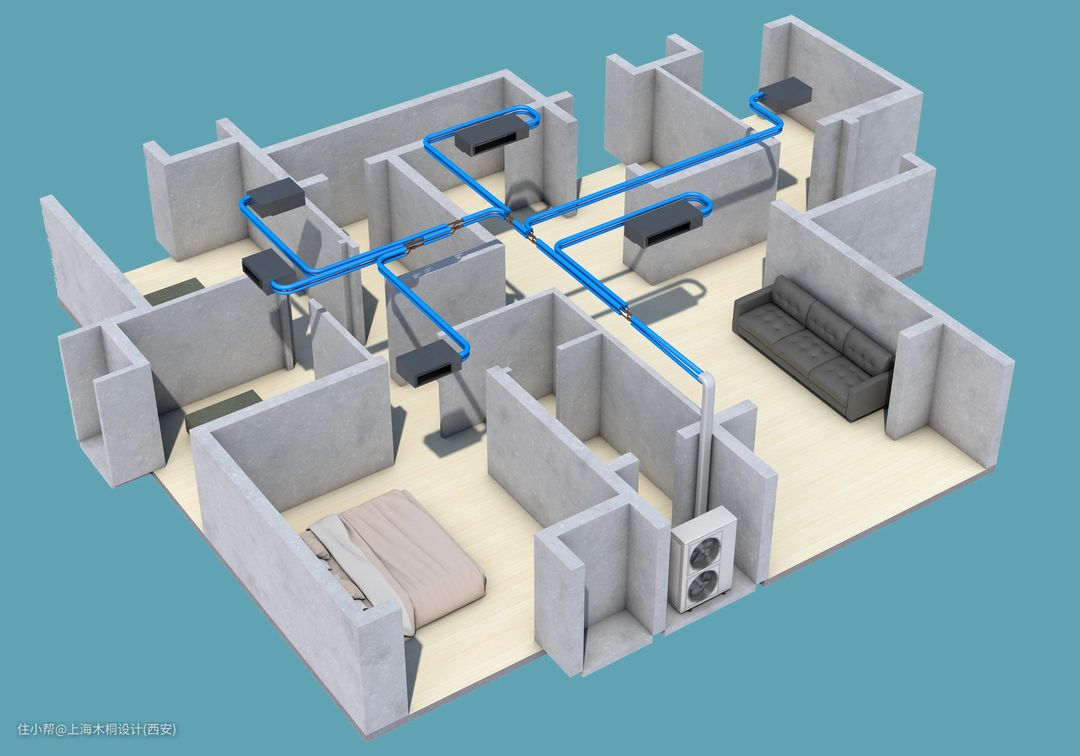 室内机需要藏于吊顶之上,而影响的因素就是吊顶的尺寸。在常见设计中,考虑到内机的尺寸,一般吊顶高度在300mm,宽度600mm。