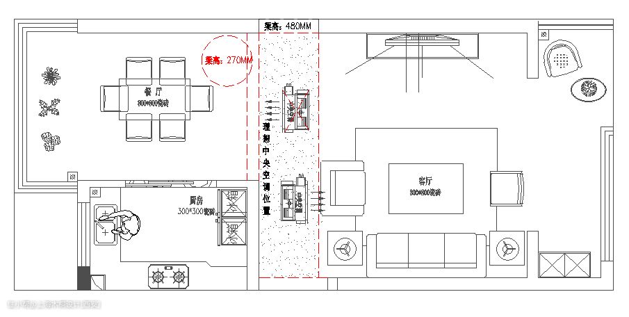 c. 客餐厅的内机要注意梁体的高度。如果中间有梁阻断,那么要根据梁的高度来确定装机的高度。