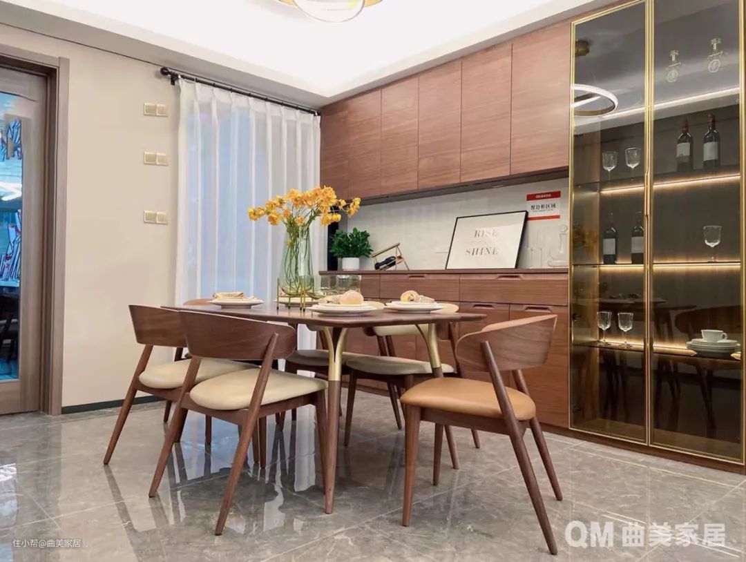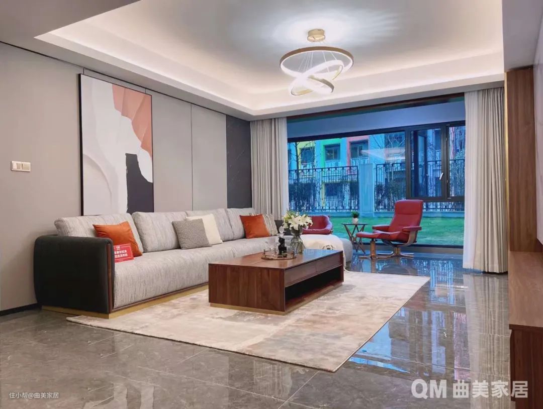 在整体设计上,采用曲美合观系列家居产品,该系列以胡桃木材质为主,雍容大气、又兼顾时尚,同时搭配金属元素和皮革、石材等一系列具有强烈质感和肌理感的材质作为搭配,可以凸显整体家居空间的品质,彰显主人的个性化品味。