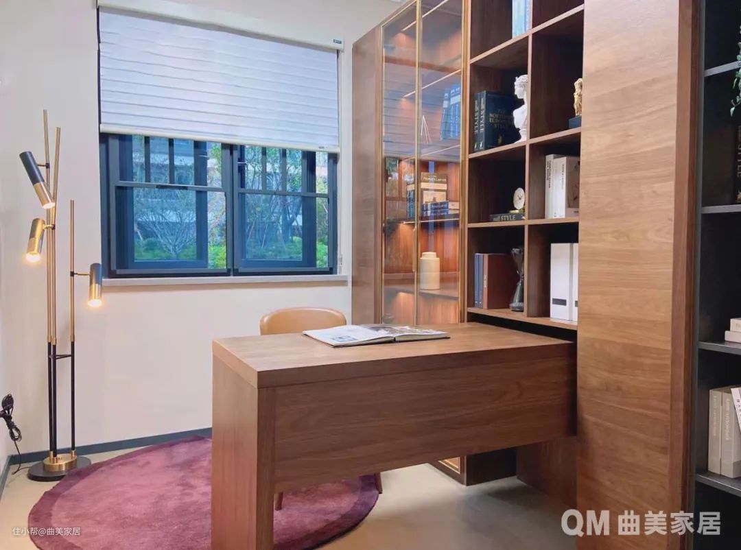 整体胡桃木书柜及书桌椅,是书房的主色调。在绿植的点缀下,不仅生机盎然,也凸显了书香气质。不仅可以满足男主人的办公之用,也因为插入式的书桌设计让出了更多空间,能让女主人摆放更多的直播设备。