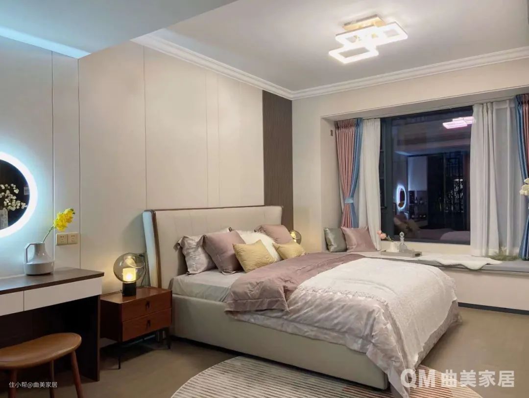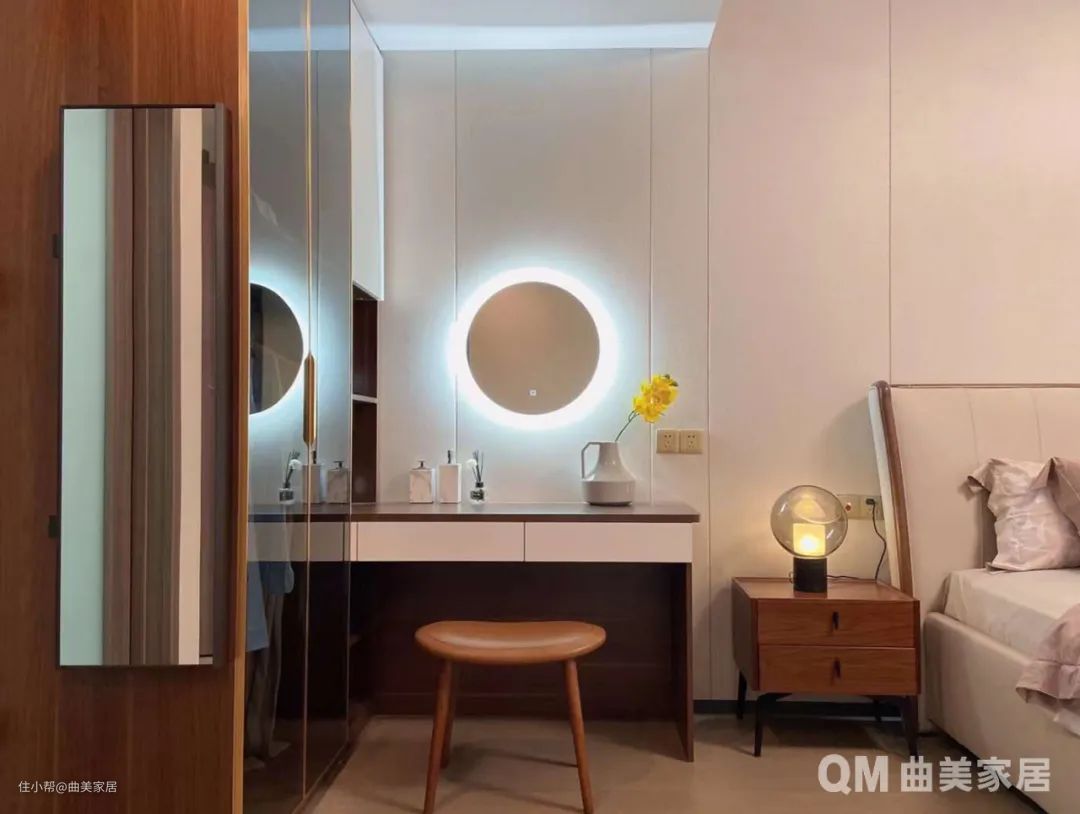 打破了主卧之前的所有布局,摒弃常规的L型衣柜,将当季常用衣物和其他季节衣物分置,大大扩张了家里的储物收纳空间;另外做成敞开式的梳妆台,靠近卫生间也方便梳妆。整体衣柜及梳妆台以胡桃木为主要材质,增强了主卧的轻奢气质。